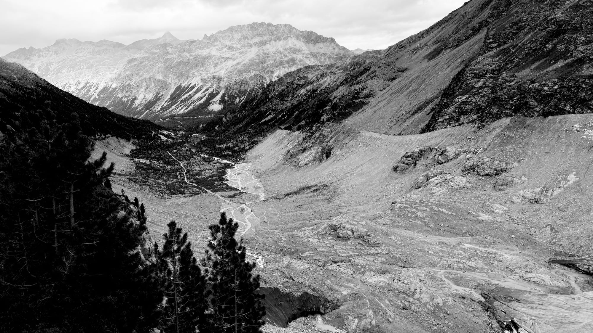 The town of Pontresina is nestled in the valley of the Bernina Pass. If you grab the train in Pontresina and start to head up to cross the pass, you'll first reach a little train stop called Morteratsch, which is at the opening of side valley that extends south toward a massive mountain range presided over by Pizzo Bernina, and dominated by the Morteratsch Glacier.