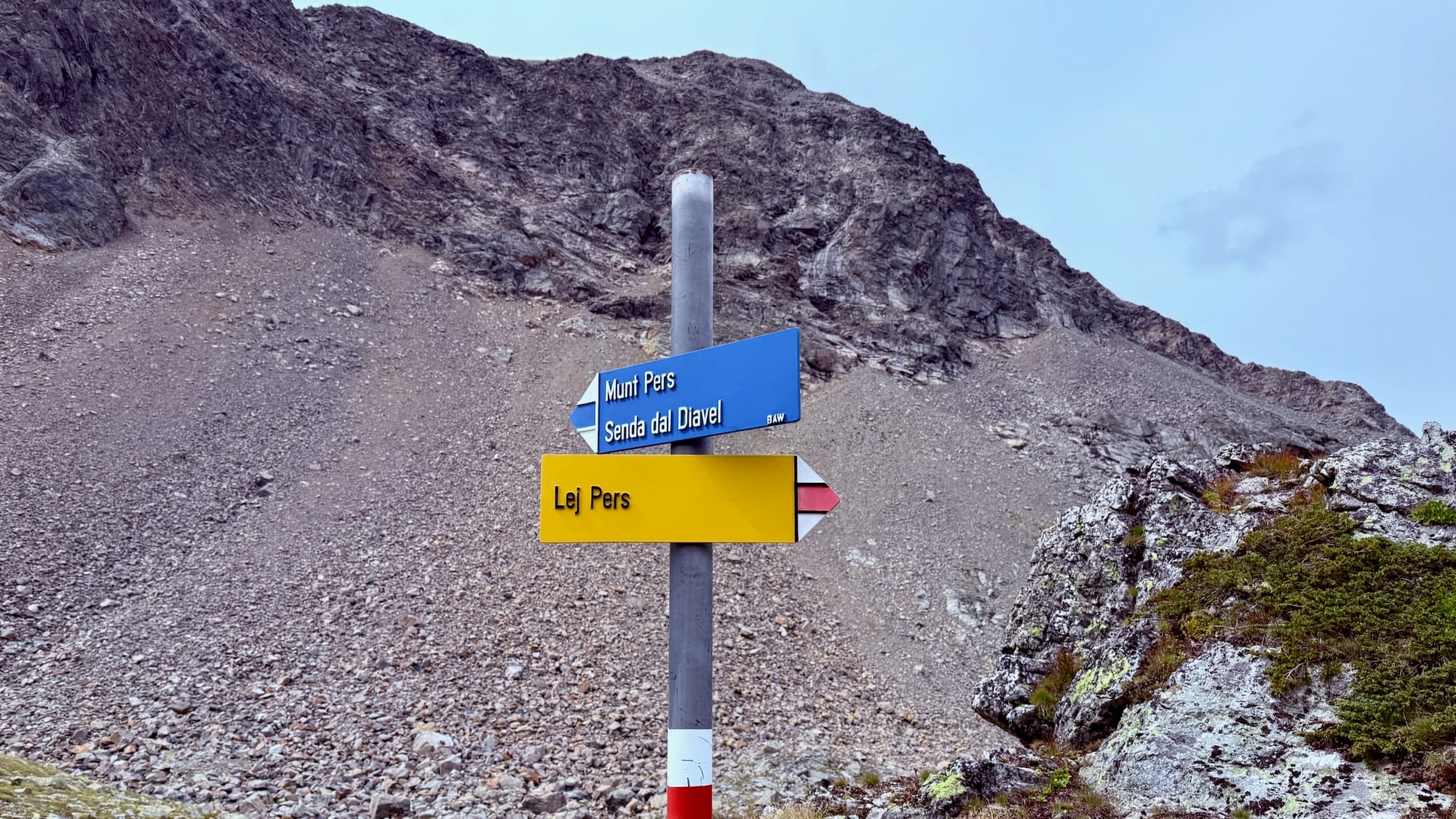 Hours and thousands of feet later, I got to the interesting decision point on the trail. Looking up at the peaks ahead, I had my doubts that the trail was passable without ropes. And then I found the blue sign post, which is Swiss for "mountaineers only". Yep, sheer cliffs ahead. Sounds fun, but not alone, and not without gear.