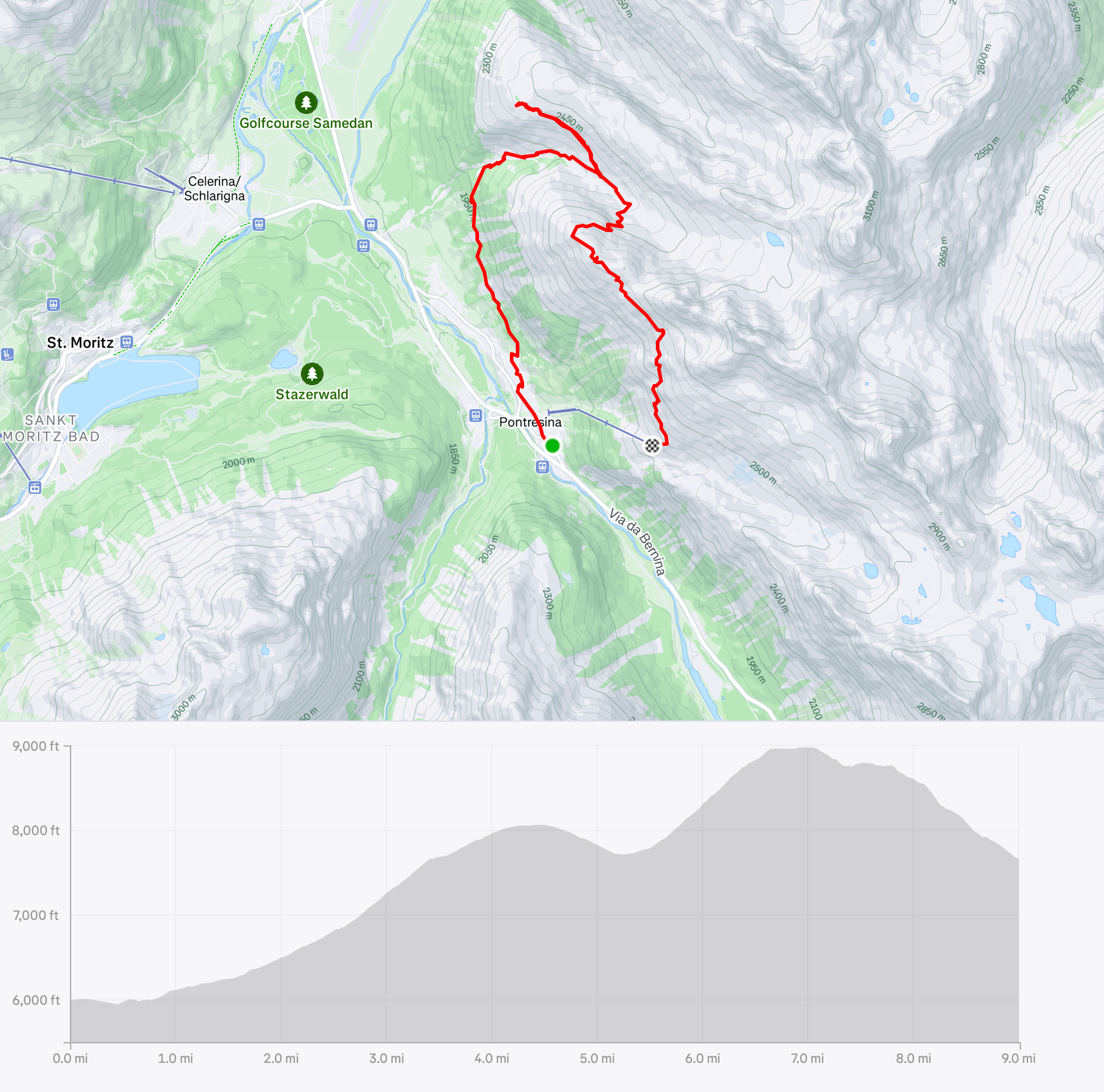 - Trailhead: Our hotel and/or the funicular stop at Muottas Murgal