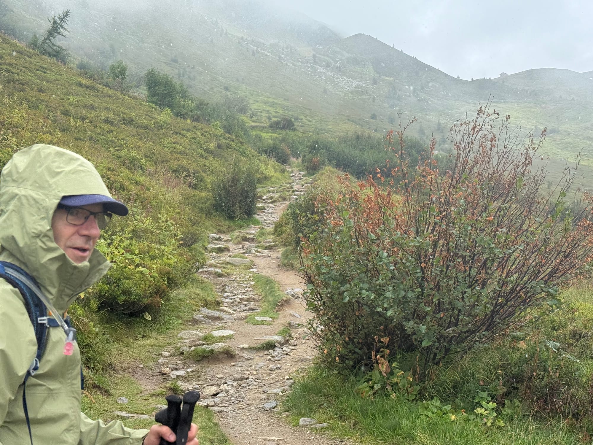 The next phase of the hike was all downhill, ending in Trient. We expected it would take us about two hours. With rain still incoming, we decided to go as far as we could rather than to sit up on top eating a picnic lunch. The rain caught us about noon, perhaps a third of the way down. We put on rain gear and kept going. Fortunately the first wave of rain only lasted about half an hour.