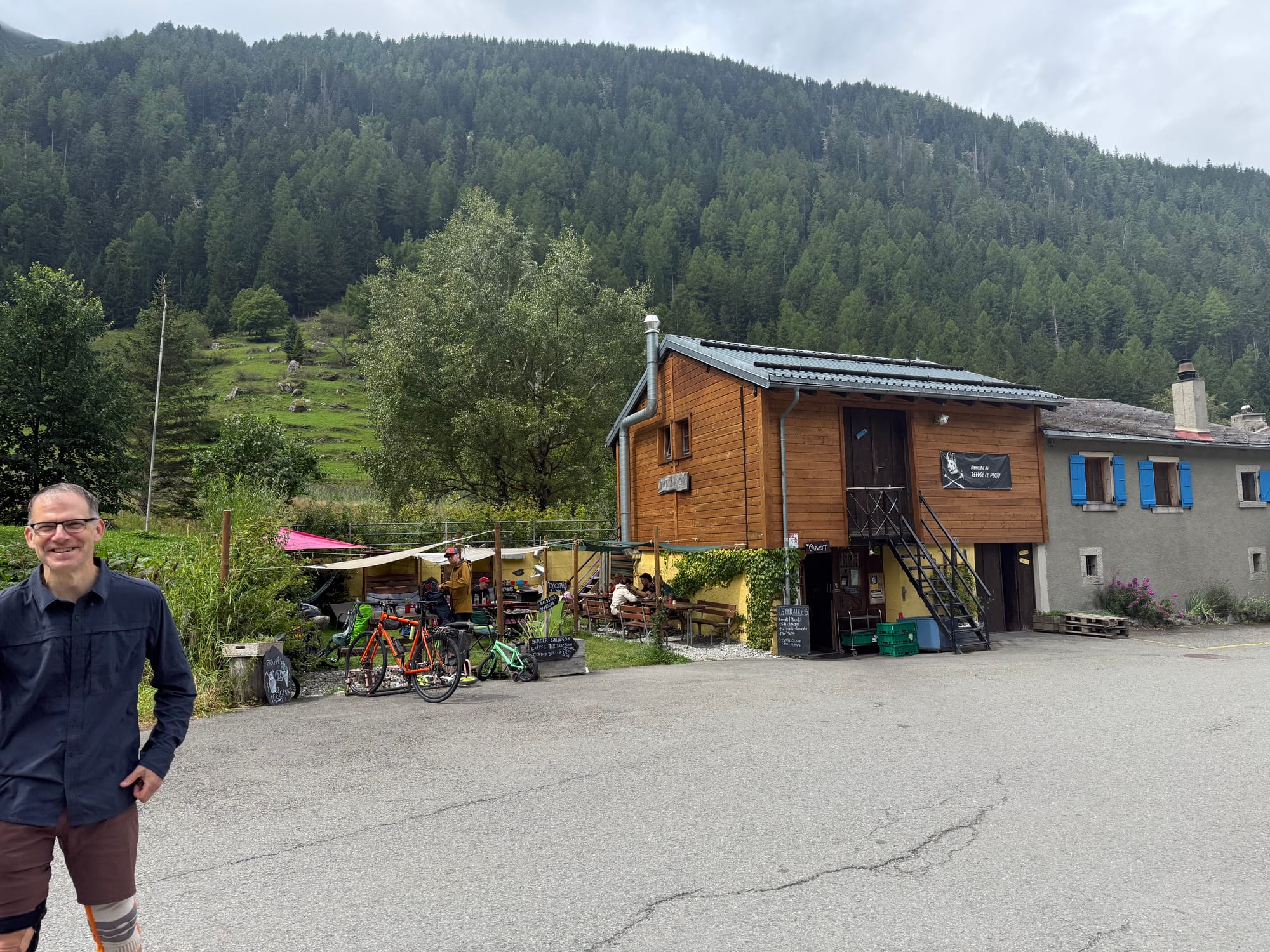 We kept going down through switchbacks and forest, arriving on the outskirts of the little village of Trient around 1:30 in the afternoon. Right there was a cute little refuge serving lunch. Spectacular. We had burgers and crepes, enjoying watching the stream of hikers coming off the mountain and heading over to the nearby camping area.