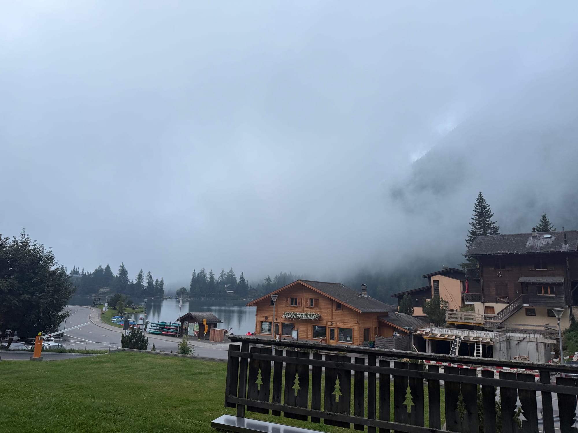 This was the cloudy morning view of Champex from our hotel porch. You can see mountains behind the clouds and the pretty little lake across the street.