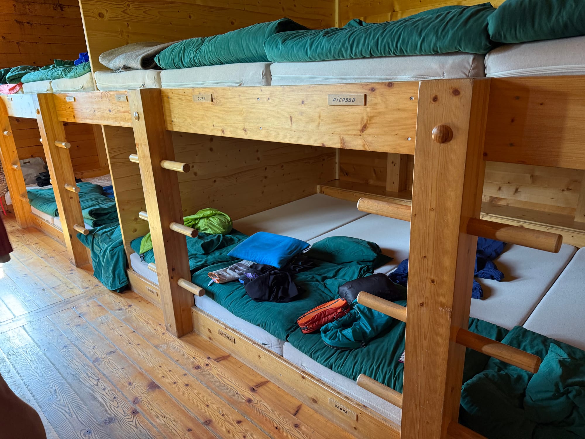 Our travel bags, packed and waiting to be shipped by taxi to our next hotel, 3 days away from us. Meanwhile, in our backpacks, we had all the stuff we needed to hike the next 3 days and stay at alpine cabins for the next two nights. You can also see other bags for other hikers heading elsewhere.