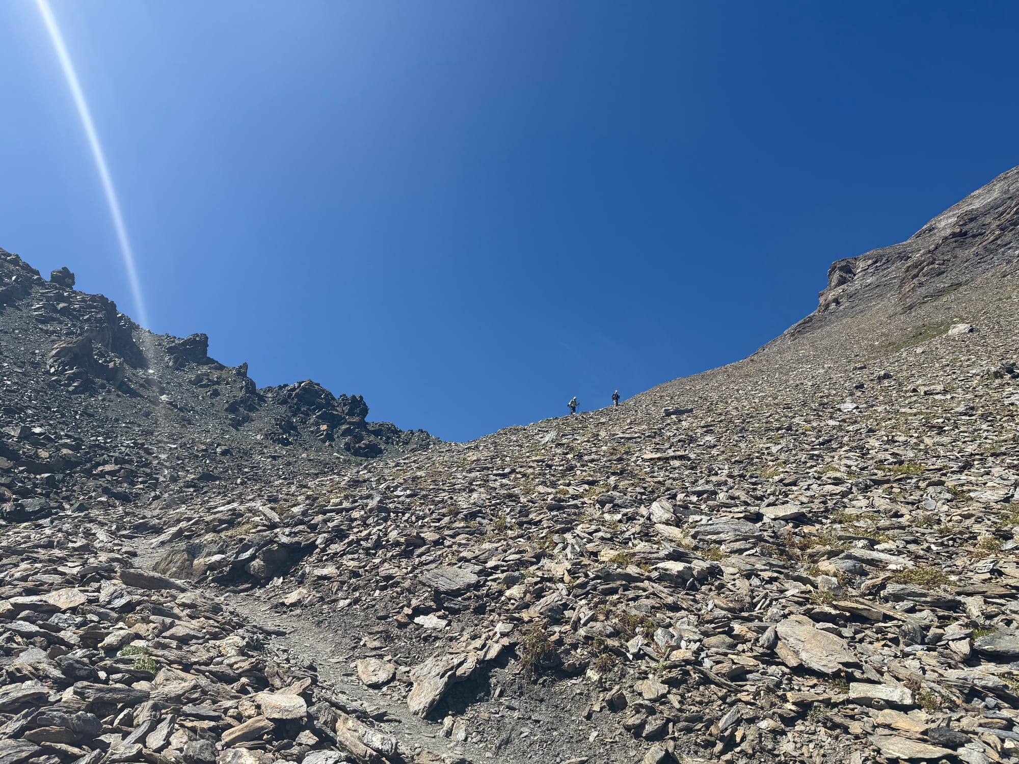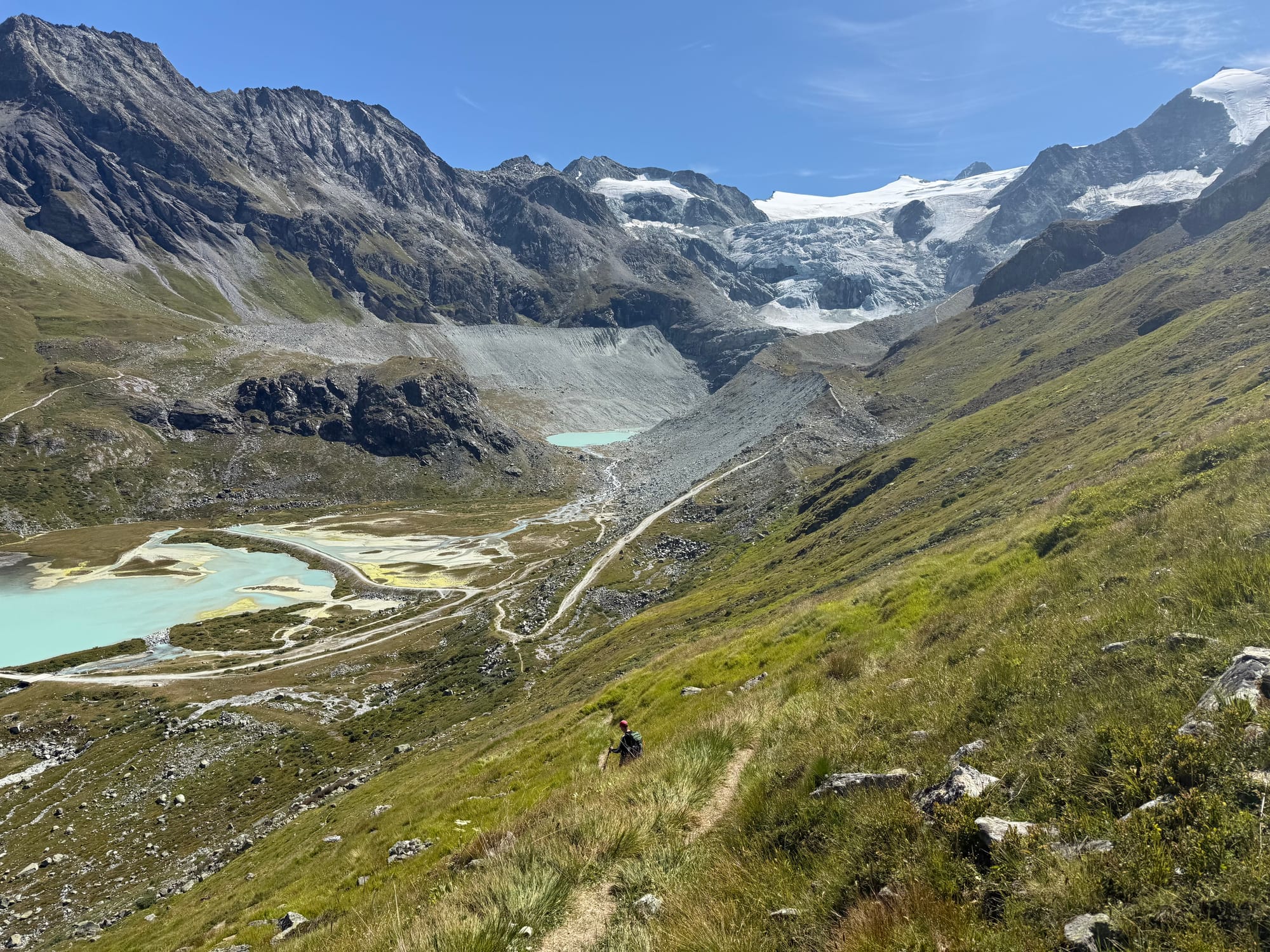 Our goal this day was to crest another high pass, drop down to a low valley with a lake and a glacier field, then climb up to the Moiry Hut to spend the night.
