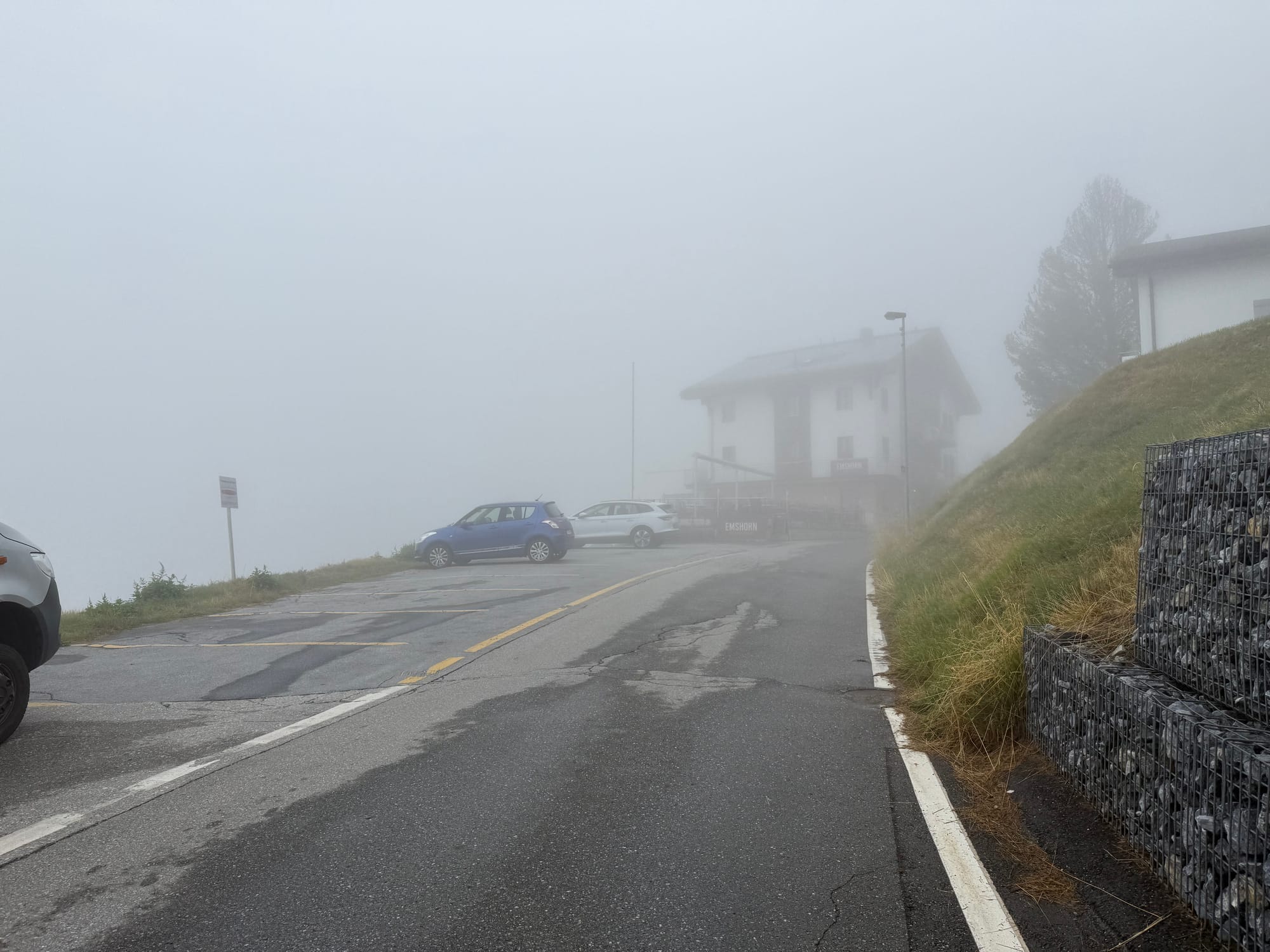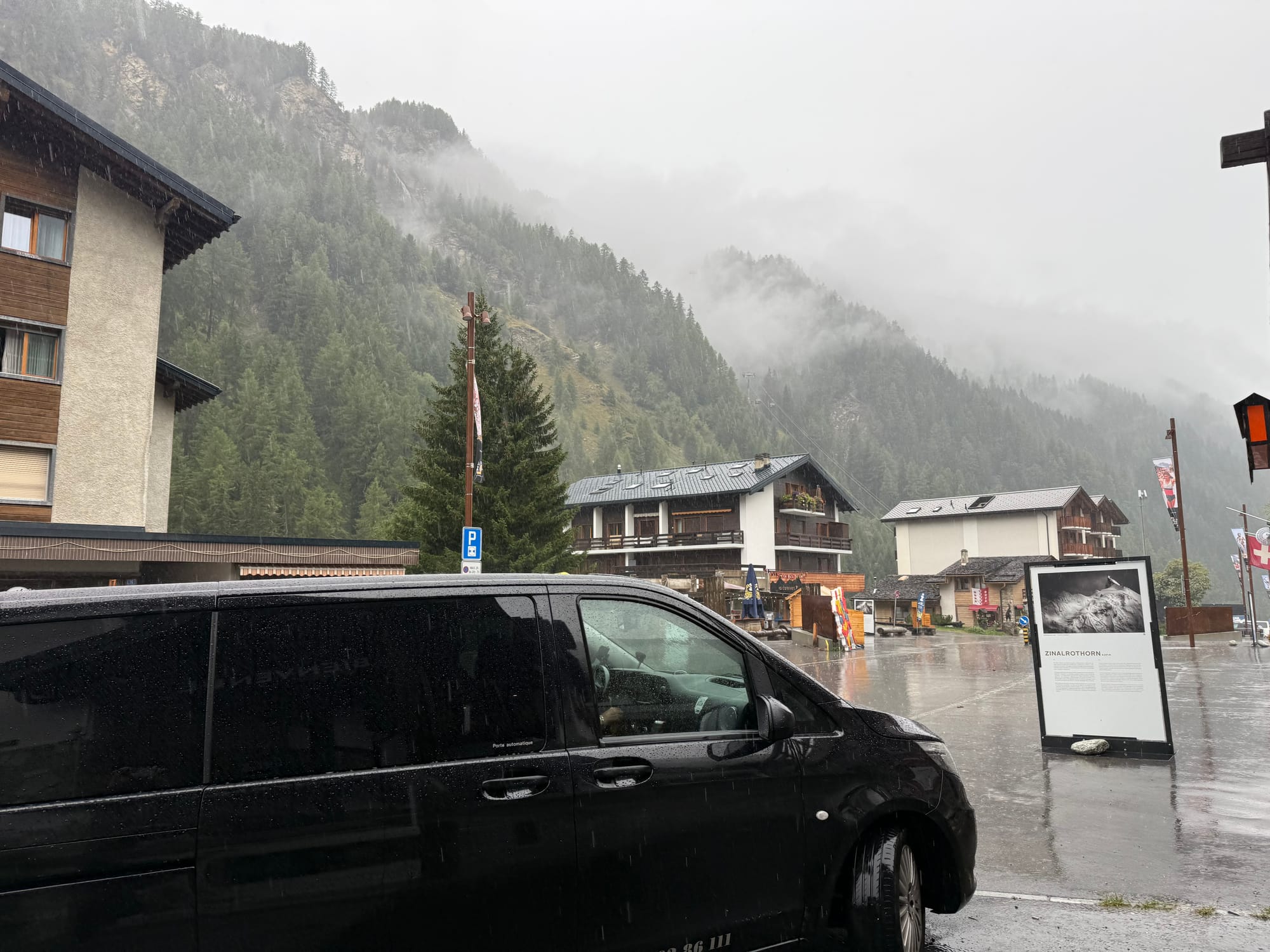 The weather that morning. The black car is a taxi that another group hired. The cloudy mountains are where we descended on gondola in clear skies the day before.