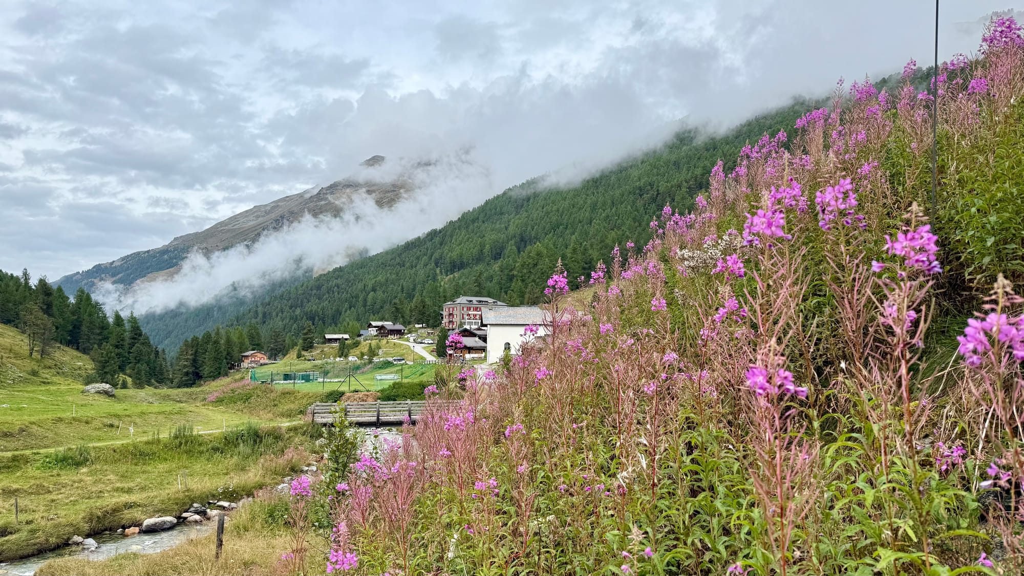 From Sion, we drove up the valley, then went up the small valley to Gruben. The road was insane: one-lane, twisty, steep drop-offs, rainy, and foggy. I've been through a lot of this kinda stuff in the Alps and this one was right up there with the most complicated (paved) that I've driven.