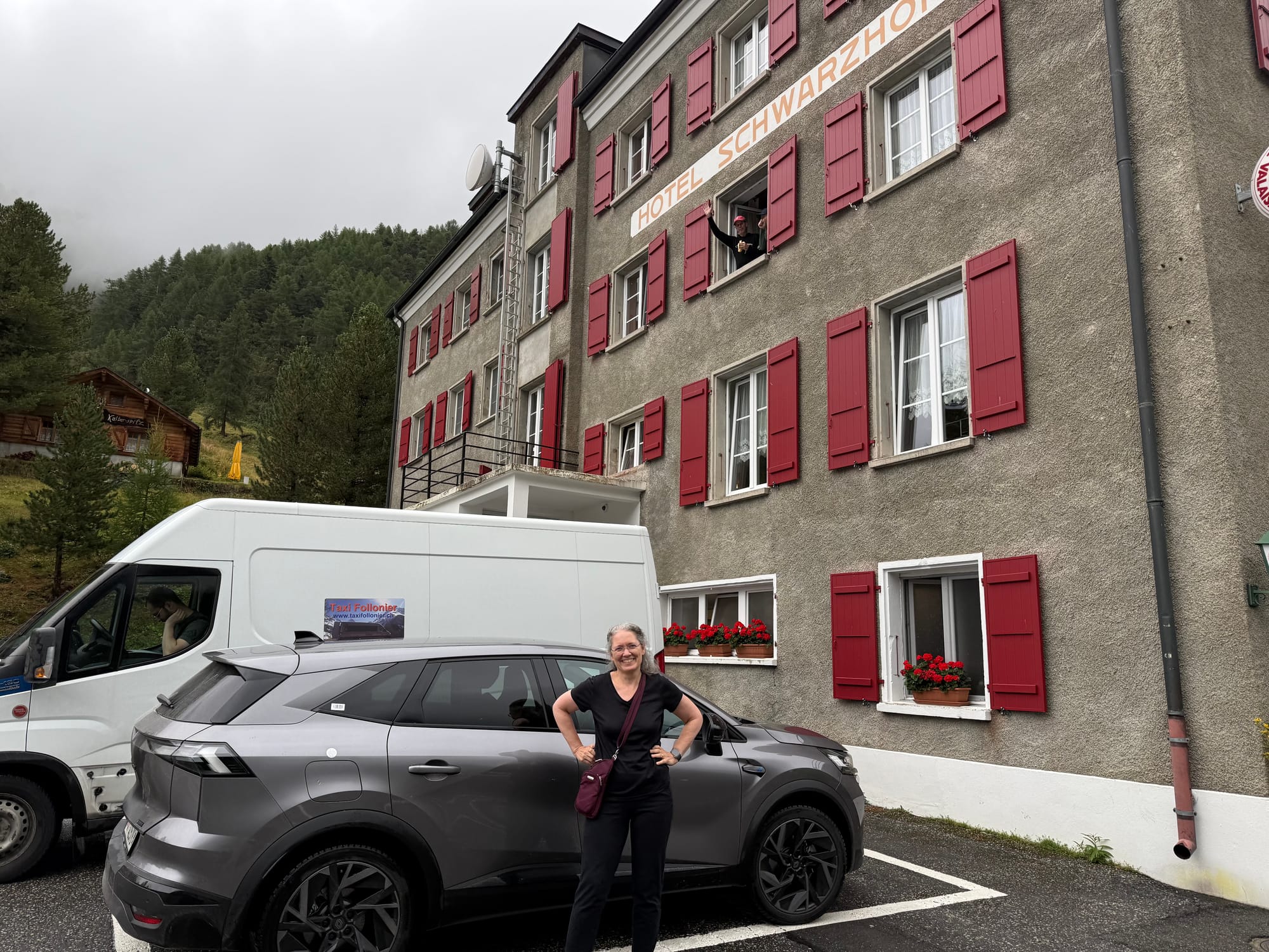 Yes: Michele. She had our rental car and was staying in an AirBnB in Champéry about an hour's drive away. "Hey hon. Up for an adventure?" She helpfully agreed to come rescue us... so she had actually come to Zinal the night before, had dinner with us, stayed in the hotel, and then drove with us over to Gruben.