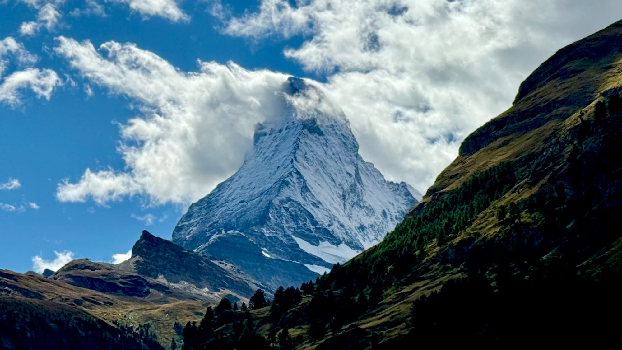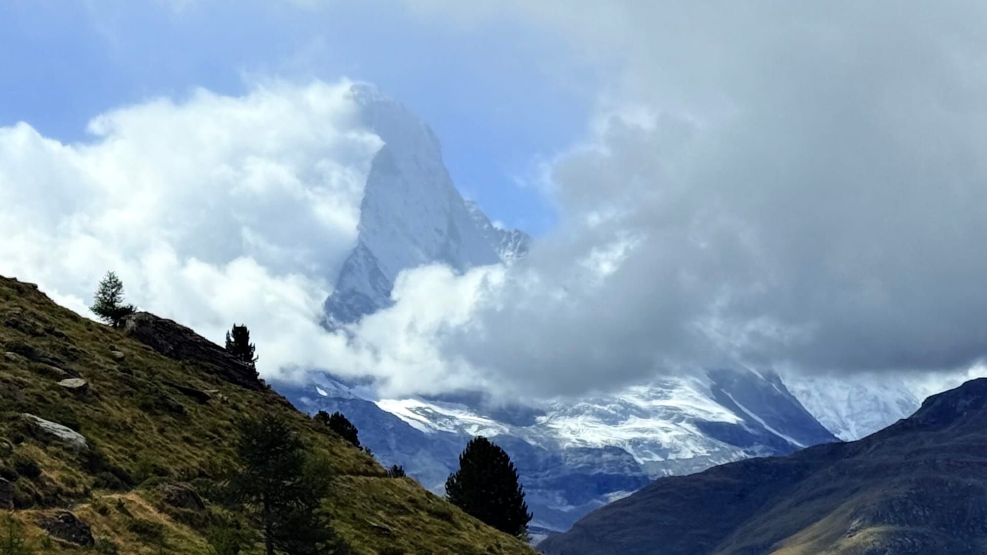 Our first view of the Matterhorn from the trail. Over the course of the hike, the clouds danced around the mountain, slowly lifting away by the end of the day.