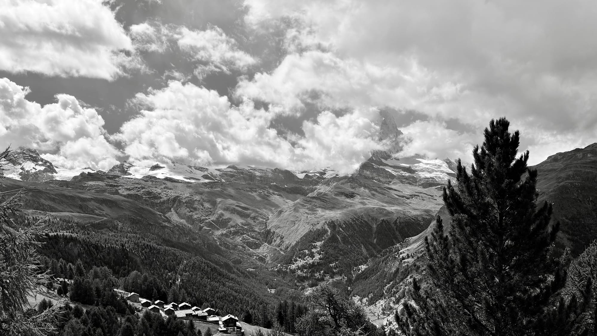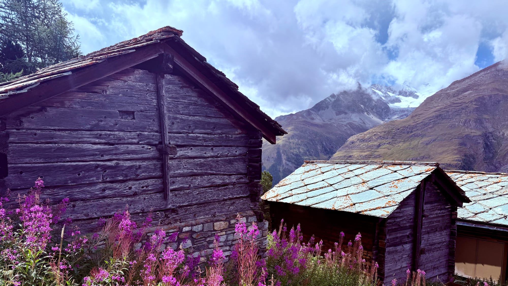 A little farming hamlet, a part of Zermatt in the valley, and the Matterhorn hiding above.